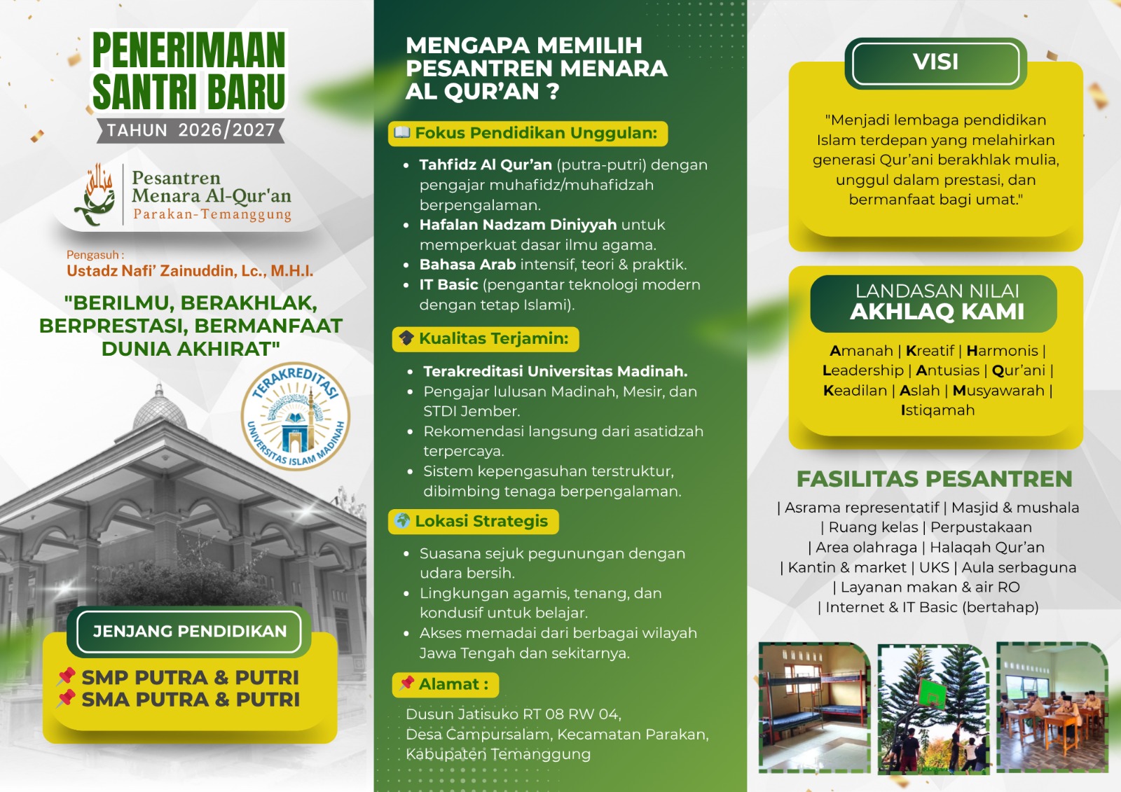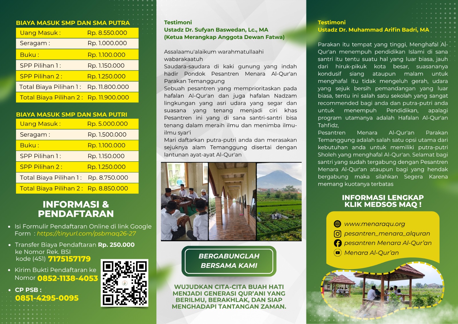 Membayar biaya pendaftaran sebesar Rp 250.000 via transfer ke Rek BSI 7175157179 a.n Menara Al Qur’an atau secara tunai di Pondok.